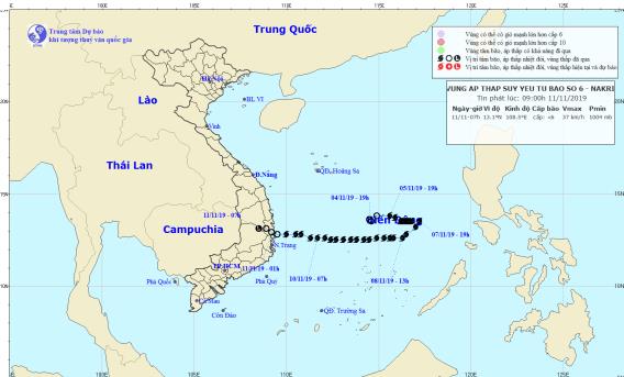 Sáng nay (11/11), áp thấp nhiệt đới suy yếu từ bão số 6 tiếp tục suy yếu thành một vùng áp thấp