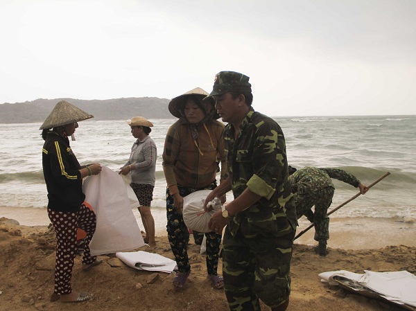 Người dân và chiến sĩ vận chuyển tập kết cát biển