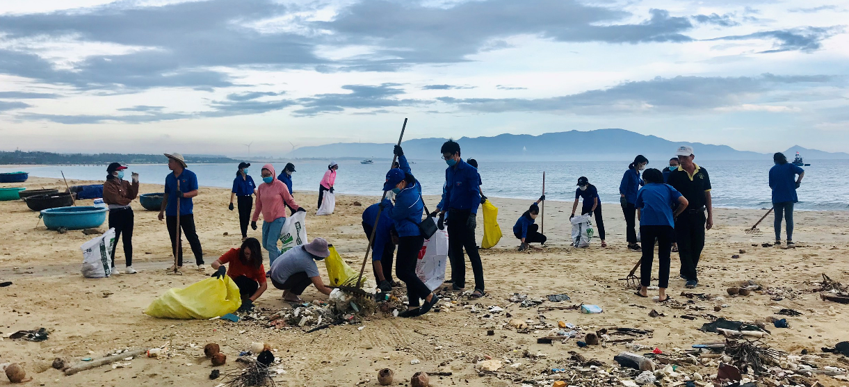 Đoàn viên, thanh niên dọn dẹp rác thải tại bãi biển xã Nhơn Lý, TP. Quy Nhơn, Bình Định ngay sau Lễ ra quân