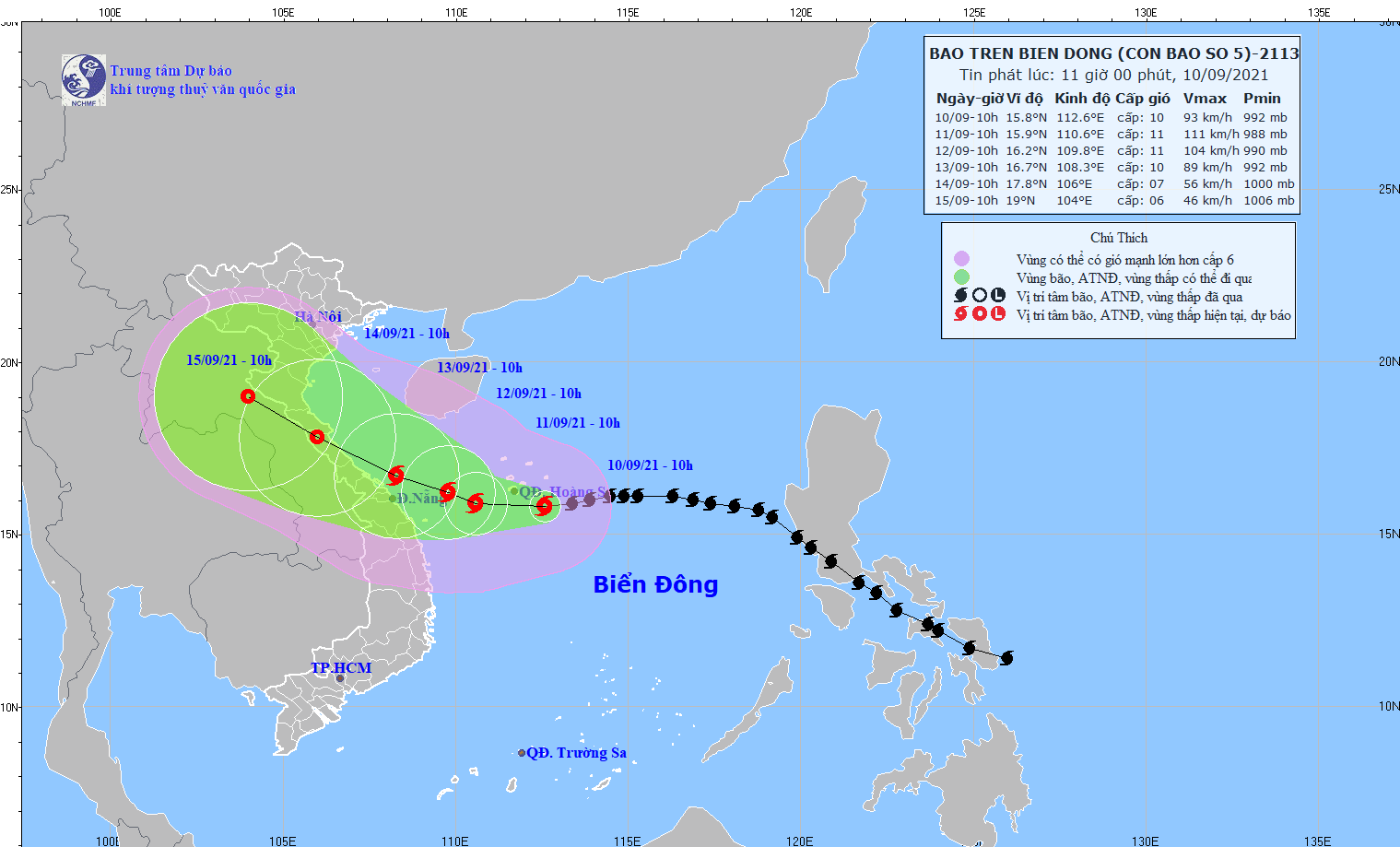 Dự báo trong 24 giờ tới, bão di chuyển chủ yếu theo hướng Tây, mỗi giờ đi được khoảng 10km và có khả năng mạnh thêm. Đến 10 giờ ngày 11.9, vị trí tâm bão ở khoảng 15,9 độ Vĩ Bắc; 110,6 độ Kinh Đông, ngay trên vùng biển phía Tây khu vực quần đảo Hoàng Sa. Sức gió mạnh nhất vùng gần tâm bão mạnh cấp 11 (100-115km/giờ), giật cấp 13.