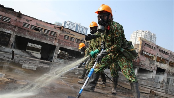 Lực lượng Binh chủng Hoá học phun hóa chất tẩy độc mặt nền nhà xưởng của Công ty Rạng Đông, ngày 5.10