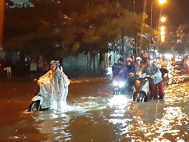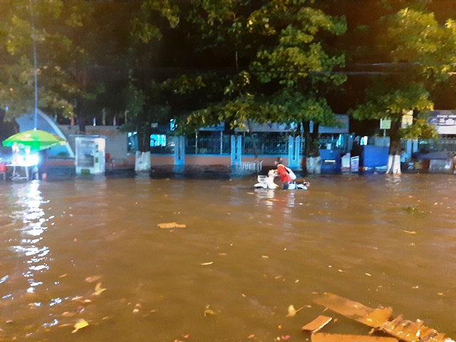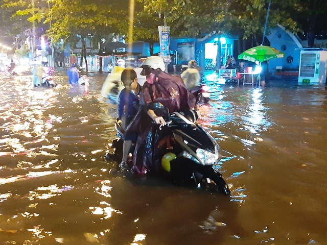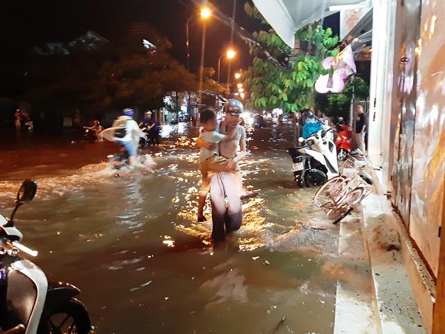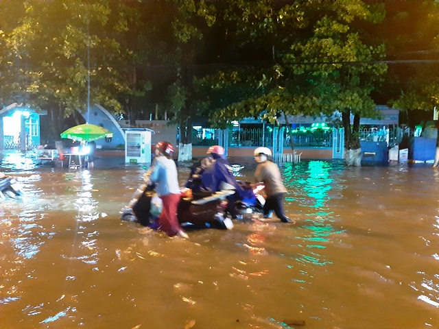 Tại một số tuyến đường như Thống Nhất, Trần Phú, 21/8, 16/4,…TP Phan Rang – Tháp Chàm nước ngập lênh láng hơn nửa bánh xe gắn máy. Cơn mưa xuất hiện vào giờ tan tầm nên nhiều nhân viên, công nhân và người dân phải bì bõm đội mưa về nhà. Nhiều học sinh đi học thêm về muộn cũng phải dắt bộ xe đạp, xe gắn máy trong mưa.