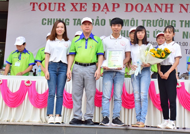 Chủ tịch UBND tỉnh Thừa Thiên Huế Phan Ngọc Thọ (áo xanh) trao giải thưởng tháng 3 cho cuộc thi "Thử thách dọn rác"