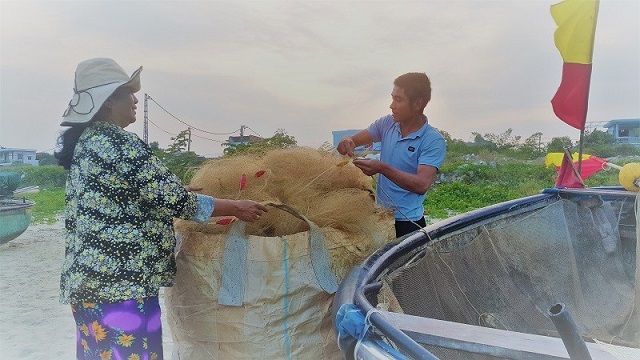 Bà Nguyễn Thị Hoa (60 tuổi) cùng con trai bên chiếc thuyền kế bên có 8 tấm lưới, bà bảo nếu kéo ra hết cũng phải dài cả cây số, mua cả 8 tấm hết gần 30 triệu đồng. Con trai bà là lao động chính trong nhà, nhưng hàng ngày bà đều ra cùng con chuẩn bị đồ ra khơi đánh bắt cá. Theo bà kể, trước đây ngày nào gia đình bà cũng thu nhập vài trăm nghìn từ việc đánh bắt hải sản, nhờ biển Nam Ô, cuộc sống của gia đình bà tuy không giàu nhưng lúc nào cũng đầy đủ, con cháu có cái ăn cái mặc, được học hành đầy đủ.