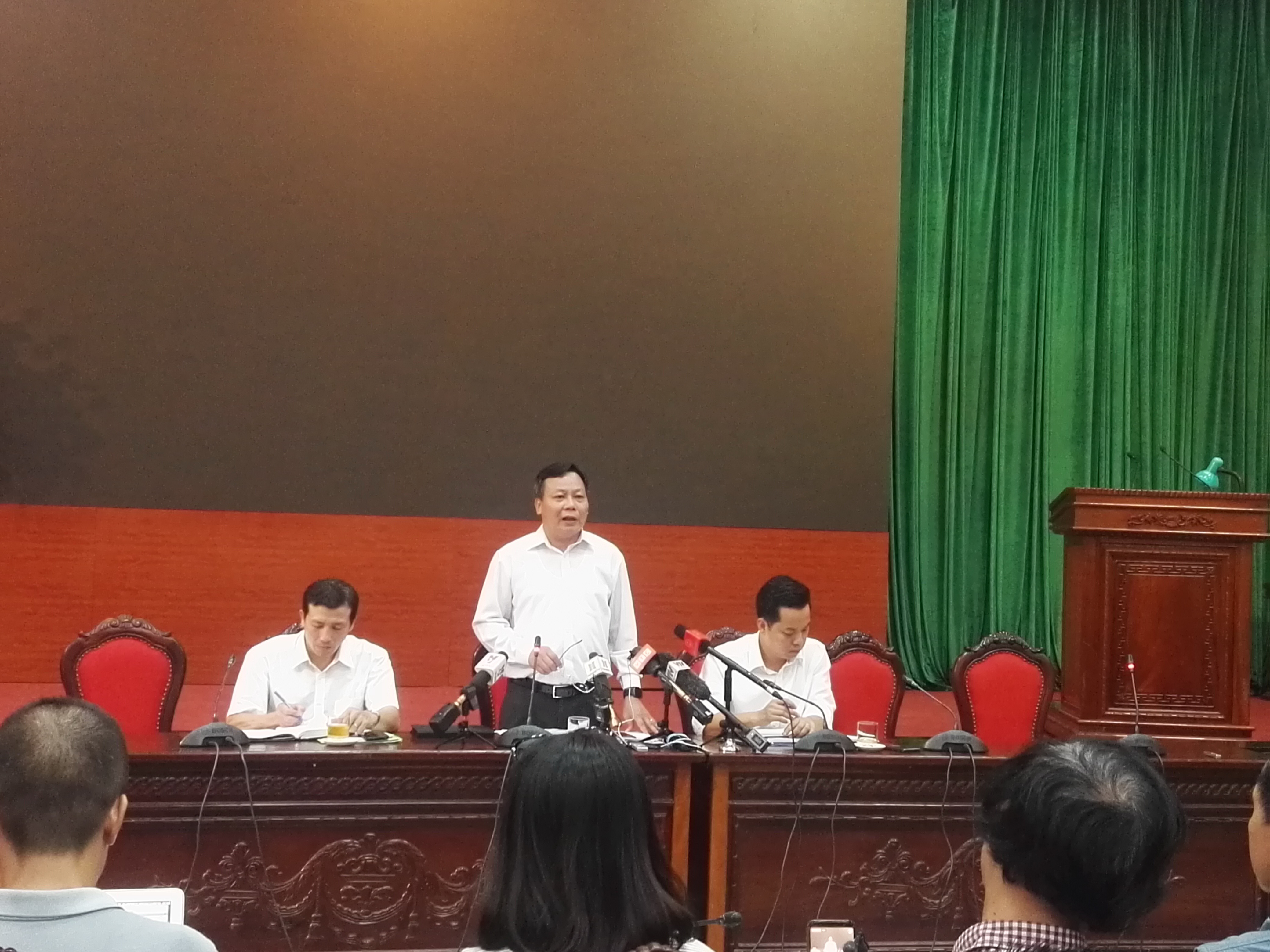 Ông Nguyễn Văn Phong, Trưởng Ban Tuyên giáo Thành uỷ Hà Nội (người đứng) chủ trì buổi họp báo có nội dung liên quan đến vụ cháy tại Công ty CP Bóng đèn Phích nước Rạng Đông