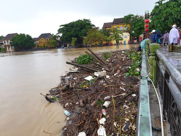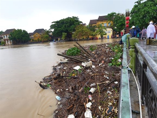 Rác từ thượng nguồn Thu Bồn đổ về tấp lại khu vực cầu An Hội (Hội An) nên phải nâng nhịp cầu ở giữa để khơi thông dòng chảy