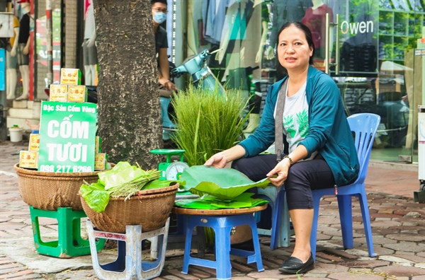 Ngang con đường Xuân Thủy - Cầu Giấy, quãng quãng lại thấy thúng hàng nho nhỏ của các bà, các mẹ ngồi bán cốm. Với một hai chiếc mẹt nhỏ, vài cánh lá sen xanh và không thể thiếu bó rơm nếp óng ả, gánh cốm là dấu hiệu cho biết mùa thu đã về.
