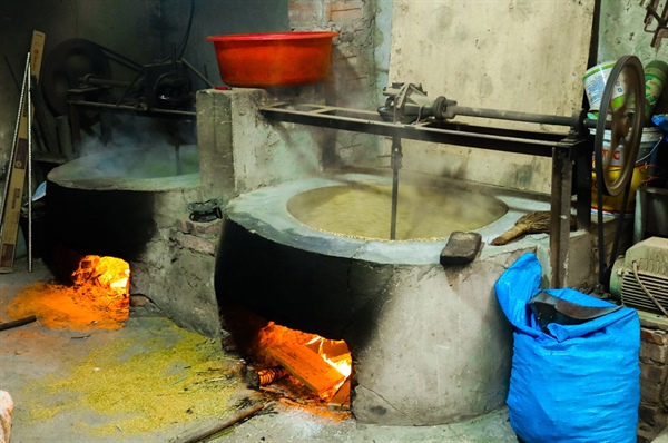 Càng gần cổng làng Vòng, những gánh cốm lại càng san sát khiến cho ánh mắt người qua lại cũng thêm rộn ràng, háo hức. Làng Vòng không lớn nhưng dân cư thì ngày càng đông đúc, tuy nhiên, số người làm cốm lại cứ ít dần theo thời gian. Gia đình chú Nguyễn Văn Tuyến là một trong bảy hộ còn “nặng lòng” với nghề cha ông để lại. Chúng tôi đến nhà chú từ sớm tinh mơ để xin “bám càng” chú sang Đông Anh gặt lúa nếp non mang về làm cốm.