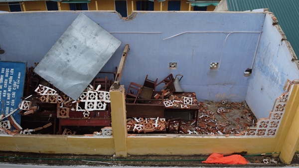 Một công trình trường học trên địa bàn tỉnh Thừa Thiên Huế bị gió bão cuốn bay mái, hư hại nhiều hạng mục