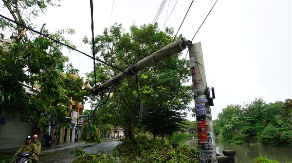 Một trụ điện bị gió bão đánh đứt gẫy, nguy hiểm cho người đi đường