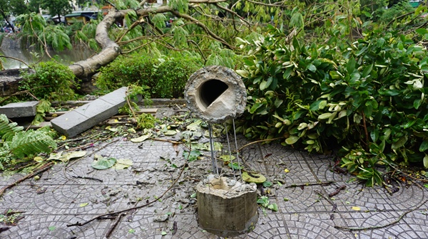 Một số hình ảnh cây xanh ngã đổ, trụ điện cũng bị gió bão quật gãy, đứt ngã gây nguy hiểm