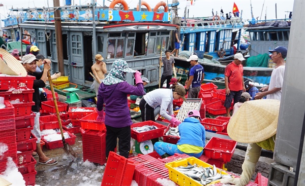 Đến trưa ngày 17.9, tại cảng cá Thuận An nhiều tàu cá đang đẩy nhanh việc bán hải sản để về phòng chống bão