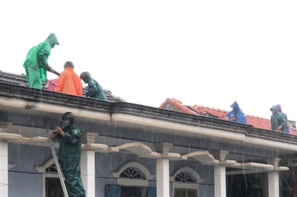 Các lực lượng ở xã Phong Hiền hỗ trợ các nhà dân bị tốc mái lợp lại mái trước khi bão số 5 đổ bộ. Ảnh: Đ.B