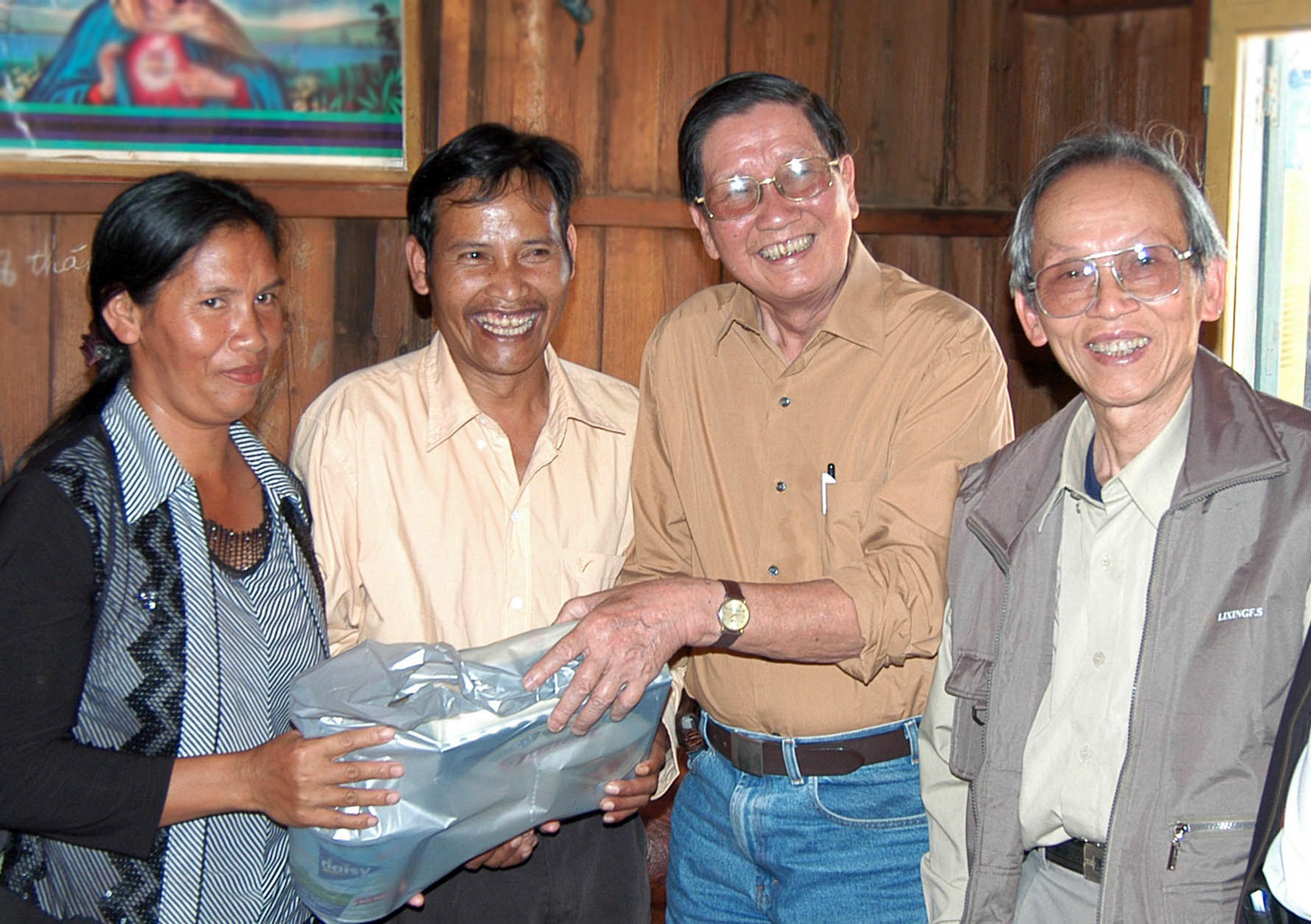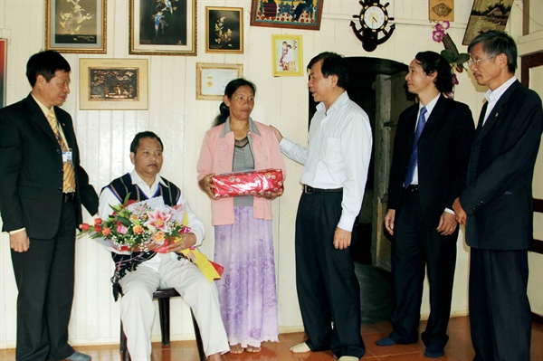 Ngành Bưu điện Lâm Đồng thăm Anh hùng Lao động Ha K’riêng (người ngồi mặc áo thổ cẩm)