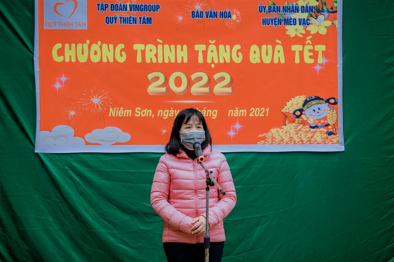 Tổng Biên tập Báo Văn hóa Chu Thị Thu Hằng xúc động nói: “Đoàn công tác thay mặt cán bộ, nhân viên, người lao động của Báo Văn Hóa và Quỹ Thiện Tâm mong muốn góp một chút hơi ấm ngày Tết với bà con. Trước những khó khăn do dịch Covid-19 diễn biến phức tạp, hy vọng những phần quà Tết Báo Văn Hóa và Qũy Thiện Tâm thuộc Tập đoàn Vingroup trao tặng góp phần giúp đồng bào các dân tộc huyện Mèo Vạc đón Tết thêm phần sung túc, đủ đầy. Mong rằng huyện Mèo Vạc ngày càng phát triển, ngày càng thu hút được nhiều nhà đầu tư, doanh nghiệp; phát huy tiềm năng, thế mạnh, thu hút khách du lịch đến tham quan, khám phá mảnh đất còn rất hoang sơ, giàu bản sắc văn hóa này”.