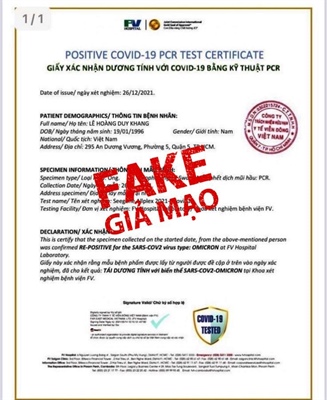 Bệnh viện FV khẳng định, “Giấy xác nhận” nêu trên là hoàn toàn giả mạo cả về hình thức lẫn nội dung. Cụ thể, tại Bệnh Viện FV không cấp “Giấy xác nhận dương tính với Covid-19 bằng kỹ thuật PCR” mà chỉ cấp “Giấy xác nhận âm tính với Covid-19 bằng kỹ thuật RT-PCR” có mã QR xác thực cho riêng từng mẫu xét nghiệm. Trên hệ thống dữ liệu của bệnh viện cũng không có bệnh nhân nào tên là “Lê Hoàng Duy Khang”.
