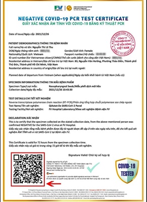 Bệnh viện FV cho biết, chỉ cấp “Giấy xác nhận âm tính với Covid-19 bằng kỹ thuật RT-PCR” có mã QR xác thực cho riêng từng mẫu xét nghiệm