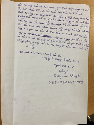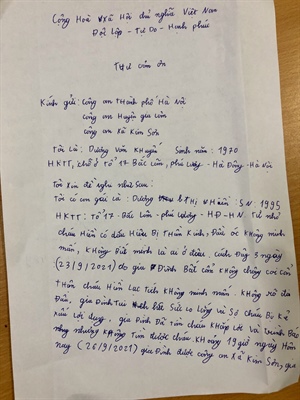 Thư cảm ơn Công an TP. Hà Nội, công an huyện Gia Lâm, công an xã Kim Sơn của ông Dương Văn Khuyến, bố đẻ cô gái