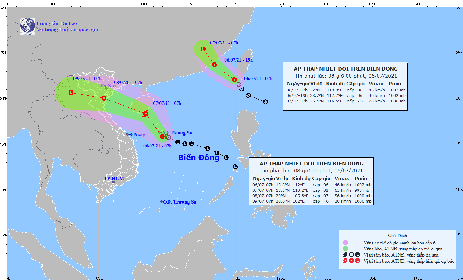 Công điện nêu rõ, theo bản tin của Trung tâm Dự báo Khí tượng thủy văn Quốc gia, hồi 16h00 ngày 5.7, vị trí trung tâm vùng áp thấp ở vào khoảng 14,5-15,5 độ Vĩ Bắc; 114,0-115,0 độ Kinh Đông, cách quần đảo Hoàng Sa khoảng 300km về phía Đông Nam. Dự báo trong 24 giờ tới, vùng áp thấp di chuyển theo hướng Tây Bắc và có khả năng mạnh lên thành áp thấp nhiệt đới; kết hợp gió mùa Tây Nam nên trên biển Đông và vùng biển từ Bình Thuận đến Cà Mau gió mạnh dần lên cấp 5-7, giật cấp 7-9. Đồng thời, trên vùng biển phía Đông Bắc đảo Lu-dông (Phi-líp-pin), một áp thấp nhiệt đới đang hoạt động gây gió mạnh cấp 6, giật cấp 8 trên khu vực Đông Bắc của Bắc biển Đông.
