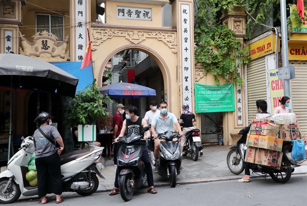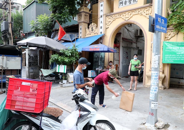 Làng An Thọ (Cổng Xanh) ngõ 514 Thụy Khuê, Tây Hồ tất cả các xe chở hàng hóa, lương thực, thực phẩm đều được yêu cầu gửi lại chốt “Vùng xanh” để người dân trong làng ra nhận