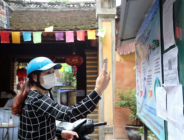 Người dân làng Yên Thái, phường Bưởi, Tây Hồ trước khi qua chốt “Vùng xanh” an toàn đều được yêu cầu quét mã QR