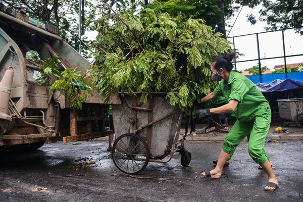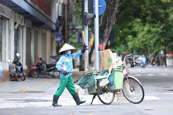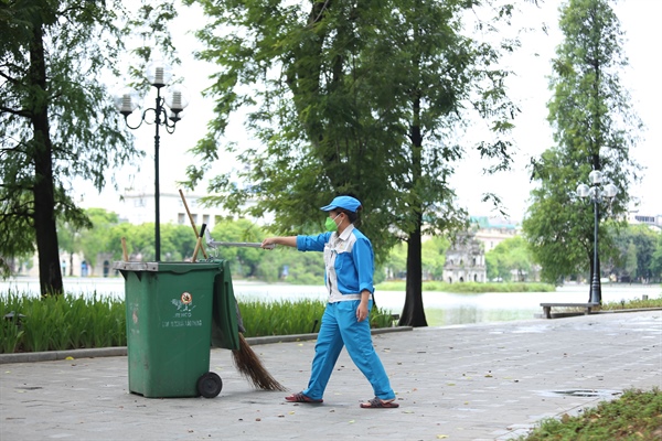 Kể từ khi Hà Nội thực hiện giãn cách xã hội theo Chỉ thị 17 của UBND TP, lượng rác thải tại các tuyến phố xung quanh hồ Hoàn Kiếm giảm đi nhiều khiến công việc của chị Trần Thị Thu Hà và 21 người trong tổ đỡ vất vả hơn. Gần mười năm gắn với nghề gom rác, nữ lao công ấy kể đã quen với từng khúc cua, từng nắp cống trên con phố Đinh Tiên Hoàng. Và nghề “phu rác” ngày nắng có cái khổ của ngày nắng, ngày mưa có cái nhọc của ngày mưa, riêng ngày bão thì các “phu rác” lại càng vất vả. Chị Hà mong rằng mỗi người dân hãy có ý thức hơn trong việc giữ gìn môi trường, không vứt khẩu trang y tế đã qua sử dụng ra lòng đường, hè phố nhất là khi dịch Covid-19 vẫn còn nhiều diễn biến phức tạp”.