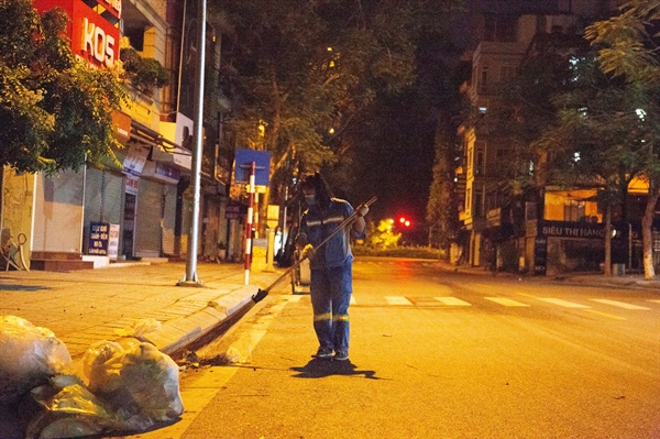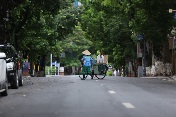 Đều đặn mỗi ngày khi Hà Nội bước vào giờ tan tầm, chị Đàm Thị Thiên lại tất tả rời nhà từ phường Đại Mỗ để tới địa điểm tập kết rác trên phố Ngọc Khánh, bắt đầu cho ca làm việc mới. Đối với những công nhân làm ca đêm như chị Thiên, công việc sẽ bắt đầu từ 19h và chỉ kết thúc vào rạng sáng khi túi rác cuối cùng lên xe tải hướng về ngoại thành. Ở tuổi 35 với 11 năm theo nghề quét rác, chưa khi nào chị thấy Hà Nội tĩnh lặng như những ngày thực hiện giãn cách xã hội do dịch Covid-19. Chị Thiên kể, những con hẻm vốn đã quen thuộc hơn cả đường về nhà nay vắng người lại qua bỗng trở lên xa lạ...
