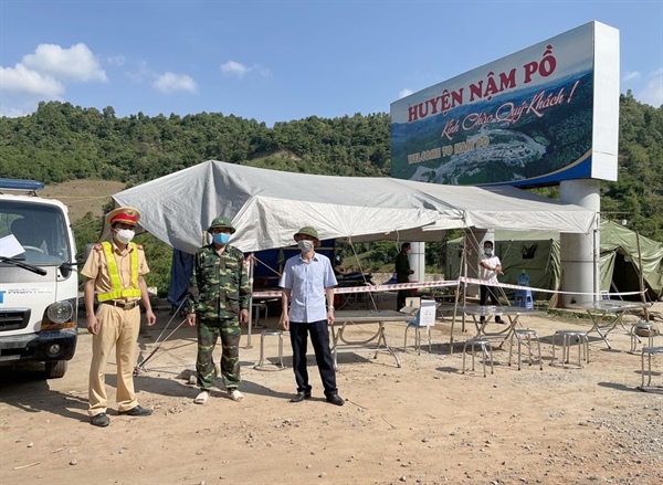 Ông Bùi Văn Luyện (bên phải), Chủ tịch Ủy ban Nhân dân huyện Nậm Pồ trực tiếp kiểm tra, chỉ đạo công tác phòng chống dịch tại chốt kiểm soát phòng dịch Covid-19 trên Quốc lộ 4H
