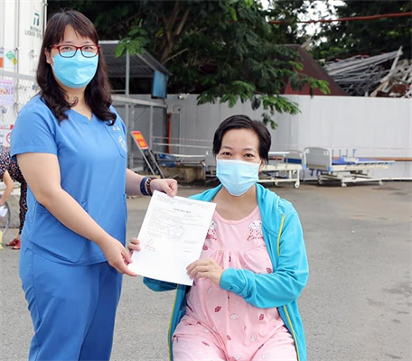 Cùng ngày, Trung tâm Hồi sức tích cực người bệnh Covid-19 trực thuộc Bệnh viện Bạch Mai tại TP.HCM đã tổ chức xuất viện cho 10 bệnh nhân nặng đã điều trị khỏi bệnh, trở về đoàn tụ với gia đình. Đặc biệt trong số này, có chị Lê Thị Kim Liên (37 tuổi) ngụ quận 7 đang mang thai 28 tuần tuổi. Trước đó, chị Liên được chuyến đến Trung tâm trong tình trạng bệnh diễn tiến nặng, sau gần 10 ngày điều trị tích cực, sức khoẻ của chị đã khỏe mạnh, thai hoàn toàn ổn định và được xuất viện trở về đoàn tụ cùng gia đình.