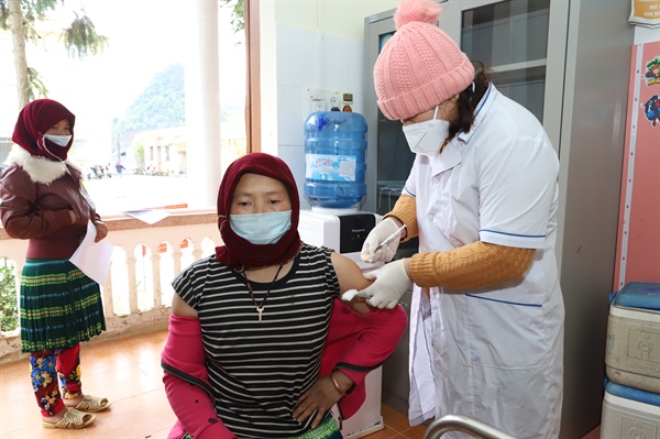 Bà con nhân dân xã Tả Lủng hối hả, tranh thủ thời gian nông nhàn đến Trạm y tế tiêm vắc xin