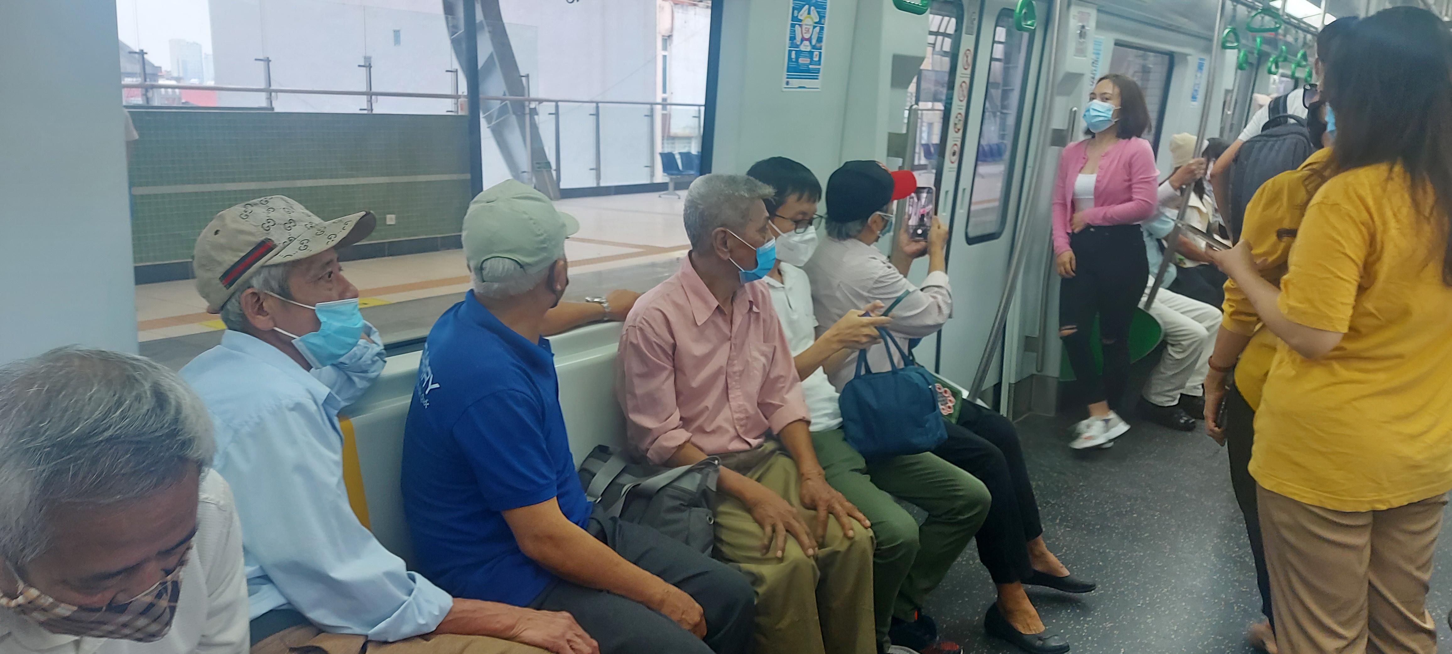 "Chúng tôi cảm thấy rất yên tâm. Nhanh, thuận tiện. Không chỉ chúng tôi mà học sinh, sinh viên, cán bộ đi làm bằng tuyến đường sắt này cũng thuận tiện. Sau này chúng tôi sẽ mua vé tháng để đi, một là thuận tiện hằng ngày, hai là giảm áp lực cho các phương tiện giao thông khác.", bác Nguyễn Hữu Vinh, 69 tuổi, nhà ở Thanh Cao, Thanh Oai (áo hồng ngồi giữa) cùng những người bạn của mình trải nghiệm chuyến tàu vận hành thương mại đầu tiên cho biết