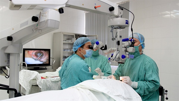 Các bác sĩ Bệnh viện Trung ương Huế tiến hành ghép giác mạc được hiến tặng cho bệnh nhân. Ảnh: BVCC