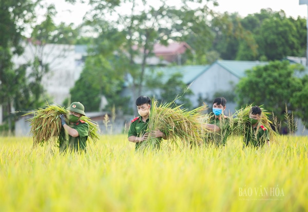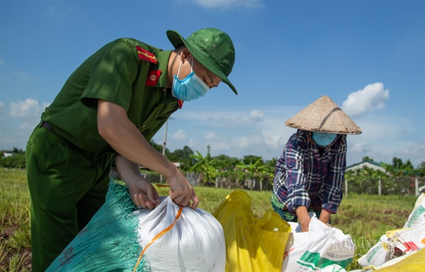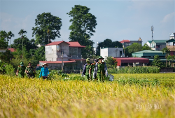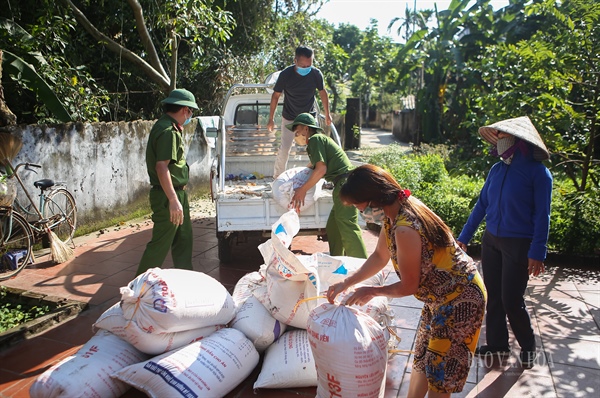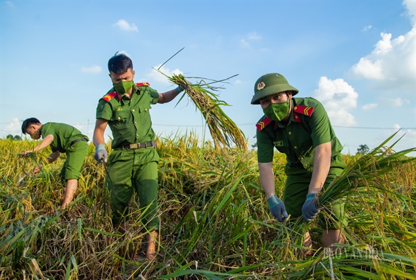 Ngày 18.9, các chiến sĩ Công an huyện Ứng Hòa đã cùng lực lượng công an xã Viên An thu hoạch lúa cho 141 hộ với gần 500 nhân khẩu không thể gặt lúa vì ở trong vùng cách ly y tế tại thôn Phù Yên, xã Viên An.