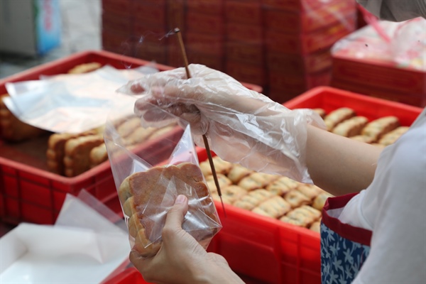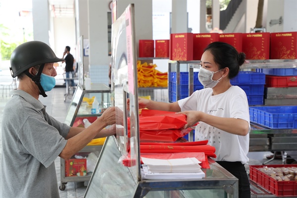 Người đến mua bánh được phát số thứ tự, xếp hàng theo chỉ dẫn của lực lượng giữ trật tự. Mỗi đợt chỉ 2 người được phép vào mua và đều phải qua xịt khuẩn tay, đo thân nhiệt.