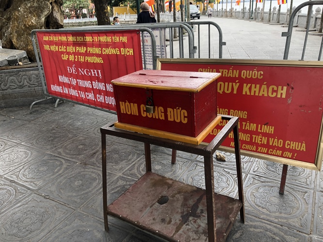 Tương tự, chùa Trấn Quốc cũng đóng cửa, không đón khách vào lễ để tuân theo quy định về phòng, chống dịch Covid-19. Biển thông báo cùng hòm công đức được chùa được đặt ở phía cổng. Nhiều người dân đến sẽ lễ vái vọng, thành tâm từ xa