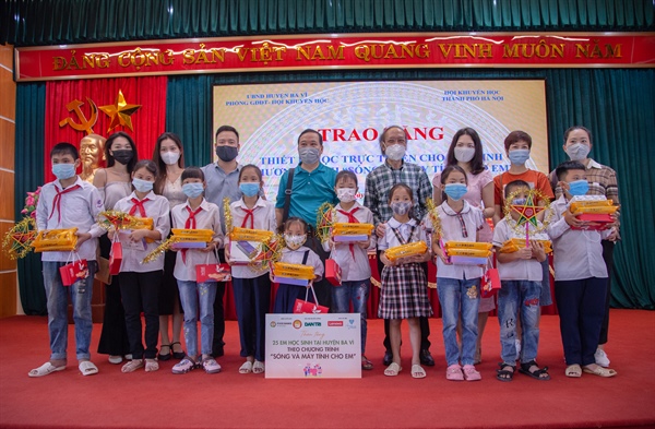 Đại diện Food Banks Vietnam trao tặng máy tính bảng cho các em nhỏ có hoàn cảnh khó khăn trên địa bàn huyện Ba Vì.