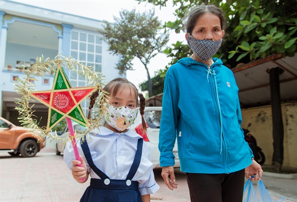 Em Phùng Thị Kim Anh và bà nội vui mừng đón nhận những món quà từ Food Banks Vietnam trao tặng.
