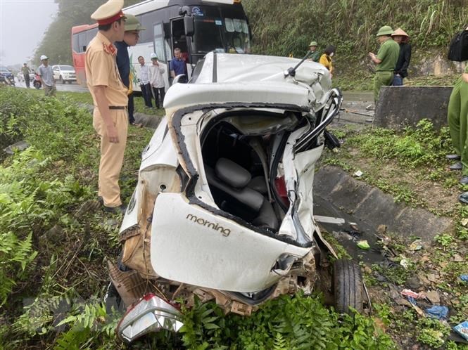 Ôtô khách bị hư hỏng phần đầu xe, ôtô con bị hư hỏng nặng, bẹp dúm hoàn toàn phần hông và sườn bên phải.
