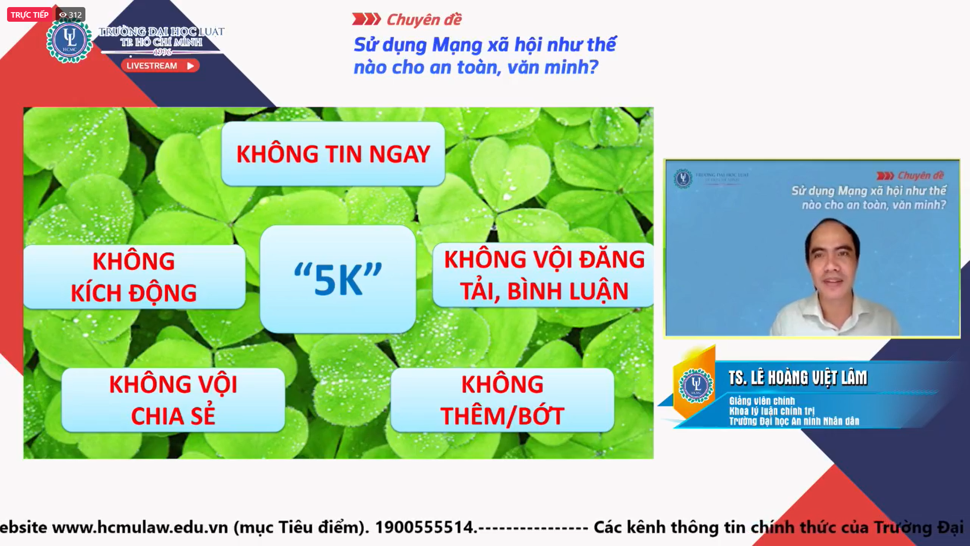 Tại buổi nói chuyện, Trung tá - Tiến sĩ Lê Hoàng Việt Lâm, Giảng viên chính Khoa lý luận chính trị Trường ĐH An ninh Nhân dân khẳng định, mạng xã hội là ảo nhưng hậu quả là thật. Muốn bảo vệ chính mình cũng như mọi người khi tham gia mạng xã hội, bên cạnh việc tuân theo những nguyên tắc, quy định mà luật pháp đưa ra, thì chính cá nhân người sử dụng phải ý thức được hành vi của mình. TS Lâm đã đưa lưu ý những điều cần thiết khi sử dụng mạng xã hội như: Tế nhị, tôn trọng và không làm phiền người khác; không đăng tải hình ảnh bản thân mọi lúc mọi nơi hay đặc biệt chú ý việc sử dụng điện thoại, mạng xã hội khi đi chung với trẻ em, khi đi đường… Cùng với đó, TS Lâm đưa ra sáng kiến về việc nên thiết lập “vùng xanh” trên mạng xã hội với chuẩn quy tắc “5K” bao gồm: Không tin ngay; Không vội đăng tải, bình luận; Không thêm/bớt nội dung; Không kích động; Không vội chia sẻ.