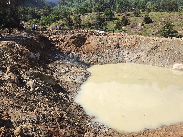 Cùng tham gia với đoàn công tác, tại hiện trường khu vực đầu nguồn suối Cra Nóa, thôn Liên Bình (xã Sơn Bình), chúng tôi ghi nhận 1 hồ chứa rộng hàng trăm mét vuông đã được làm xong. Đồng thời, một khối lượng đất, đá lớn lên đến hàng trăm m3 được đắp kiên cố chặn ngang dòng suối để làm hồ chứa nước. Chỉ một lượng nước rất nhỏ len lỏi qua những kẽ đá chảy xuống phía dưới hạ nguồn.