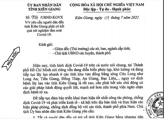 Tại công văn 994/UBND-KGVX, Chủ tịch UBND tỉnh Kiên Giang yêu cầu: Tất cả người dân đến và trở về tỉnh Kiên Giang bằng phương tiện đường bộ, đường thủy nội địa, đường hàng hải phải có kết quả xét nghiệm âm tính với SARS-CoV-2 (thời hạn không quá 72 giờ), áp dụng bắt đầu từ 0h ngày 10.7. Đối với người dân và hành khách đến tỉnh Kiên Giang bằng đường hàng không, thực hiện theo công văn 980/UBND-KGVX ngày 7.7.2021. Theo công văn 980 của UBND tỉnh Kiên Giang, yêu cầu hành khách đến thành phố Phú Quốc và Rạch Giá bằng đường hàng không phải có kết quả xét nghiệm tầm soát Covid-19, áp dụng từ 0h ngày 9.7.2021.