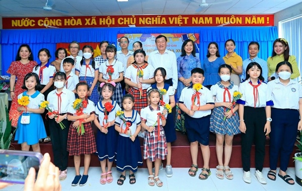 Các đại biểu chụp hình cùng các em học sinh tại Lễ trao giải
