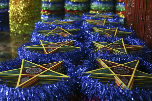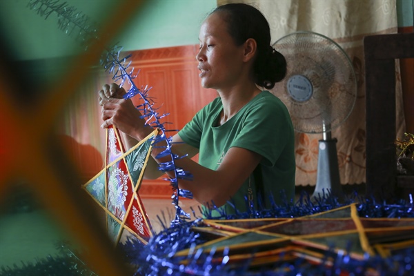 Phần vòng ngoài cùng của đèn được làm từ những nan tre mảnh được quấn tua rua giấy nhuộm các màu tươi sáng, rực rỡ. Giấy bóng màu được cắt thành những cánh sao đều tăm tắp để sẵn thành từng bó. Người thợ chỉ cần quệt hồ dán lên bộ khung tre thật cẩn thận sao cho vừa mà cánh không bị bong.