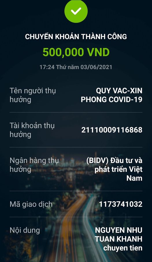 Những ngày qua, trên mạng xã hội bắt đầu lan truyền hình ảnh các cá nhân chuyển khoản tới Quỹ vắc xin phòng Covid-19 của Chính phủ. Anh Nguyễn Như Tuấn Khanh, một người lao động đang làm việc tại Bắc Giang đã đưa lên facebook cá nhân hình ảnh chuyển khoản 500.000 đồng cùng lời chia sẻ: “Chung một tay cùng đất nước chống dịch nào anh, chị, em”. Hành động của anh được nhiều bạn bè ủng hộ, anh cho rằng, 50.000 hay 100.000 đồng cũng quý, miễn là không bàng quan với dịch bệnh. “Mình ngồi điều hòa 24/24 cảm thấy áy náy với những y bác sĩ đang chống dịch dưới nắng 40 độ C”, anh Khanh bày tỏ.