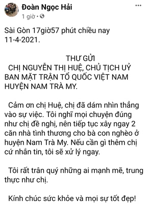 Liên quan đến việc đòi lại số tiền 106 triệu đã chuyển trước đó để huyện Nam Trà My xây nhà hỗ trợ người nghèo, vào chiều tối ngày 11.4, trên trang facebook cá nhân, ông Đoàn Ngọc Hải đăng bức thư gửi bà Nguyễn Thị Huệ - Chủ tịch Ủy ban mặt trận tổ quốc Việt Nam huyện Nam Trà My. Trong thư, ông Hải viết: "Cảm ơn chị Huệ, chị đã dám nhìn thẳng vào sự việc. Tôi nghĩ mọi chuyện đúng như chị đề nghị, nên tiếp tục xây ngay 2 căn nhà tình thương cho bà con nghèo ở huyện Nam Trà My. Nếu cần gì thêm chị cứ nhắn tin, tôi sẽ xử lý ngay”.