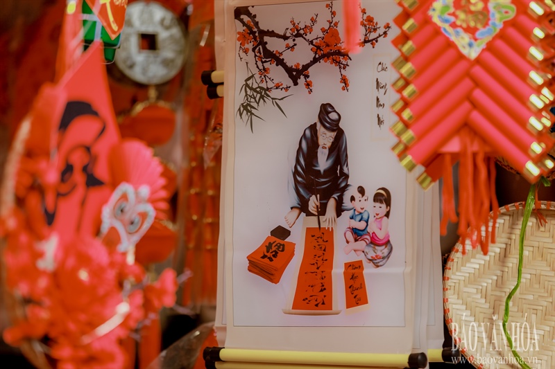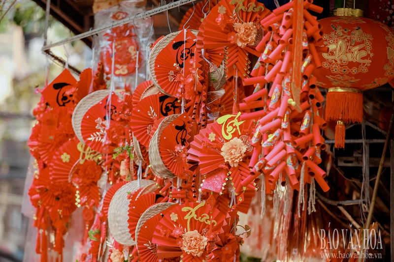 Câu đối, pháo hoa, lời chúc... cũng được nhiều gia đình tìm mua để treo lên cành đào, cây quất. Giá bán dao động từ 50.000 - 80.000 đồng/sản phẩm tùy kích thước
