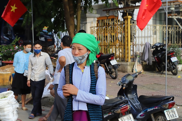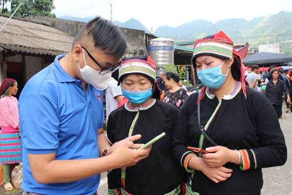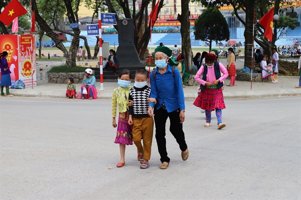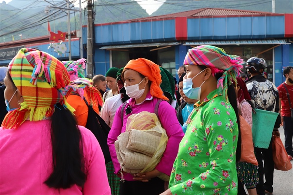 Phụ nữ người Mông hướng dẫn nhau cách đeo khẩu trang đúng cách khi ra đường