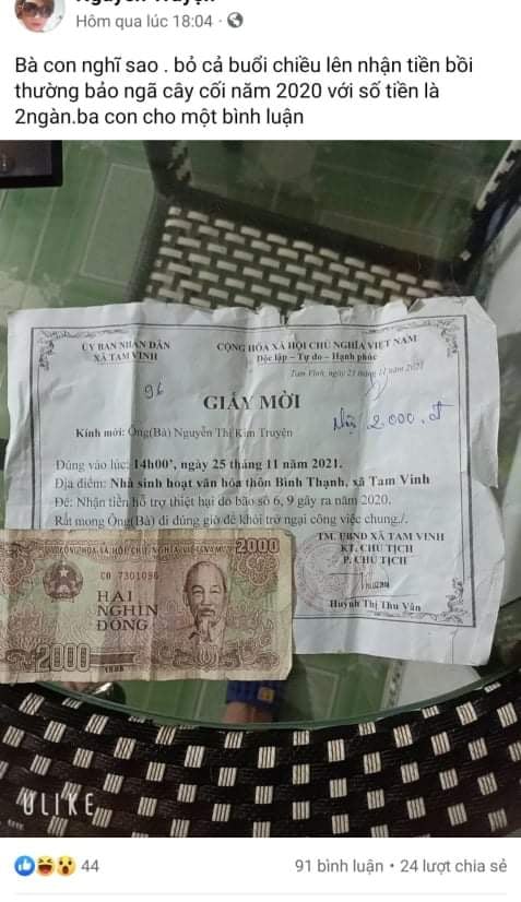 “Bà con nghĩ sao, bỏ cả buổi chiều lên nhận tiền bồi thường bão ngã cây cối năm 2020 với số tiền là 2.000. Bà con cho một bình luận”, tài khoản này viết.
