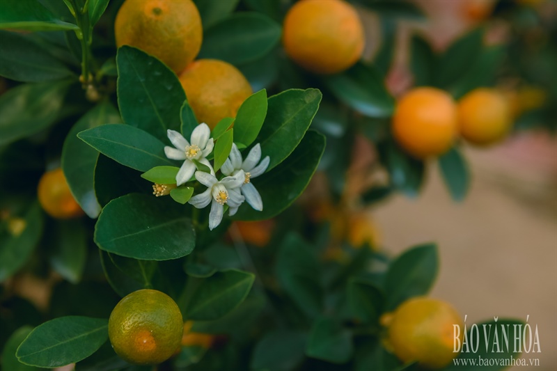 Từng chùm quất đã bắt đầu ngả sang màu vàng óng, lá xanh mướt xen lẫn ít hoa và quả xanh.