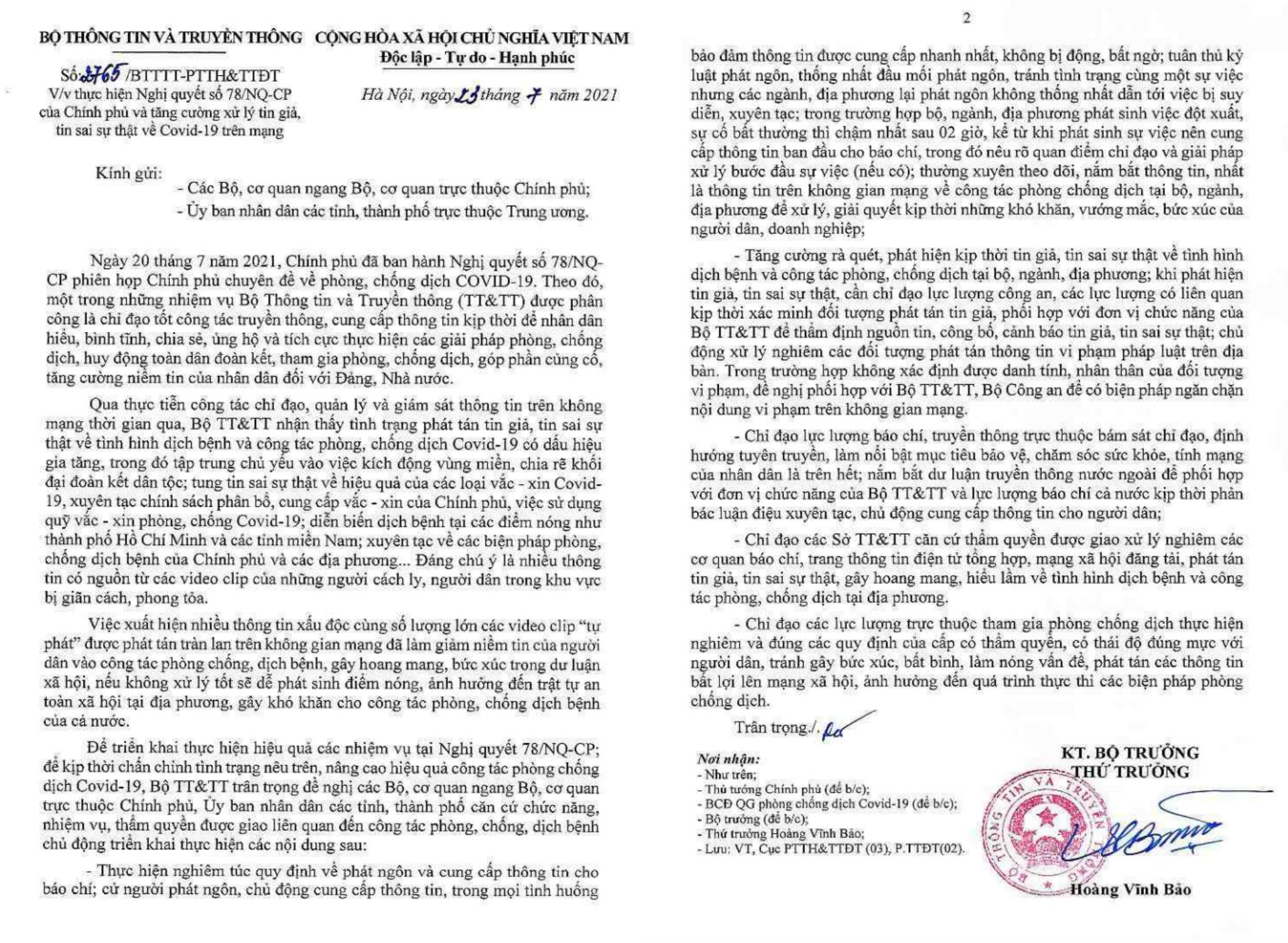 Các tỉnh thành, chỉ đạo các Sở Thông tin và Truyền thông căn cứ thẩm quyền được giao xử lý nghiêm các cơ quan báo chí, trang thông tin điện tử tổng hợp, mạng xã hội đăng tải, phát tán tin giả, tin sai sự thật, gây hoang mang, hiểu lầm về tình hình dịch bệnh và công tác phòng, chống dịch tại địa phương; chỉ đạo các lực lượng trực thuộc tham gia phòng chống dịch thực hiện nghiêm và đúng các quy định của cấp có thẩm quyền, có thái độ đúng mực với người dân, tránh gây bức xúc, bất bình, làm nóng vấn đề, phát tán cảc thông tin bất lợi lên mạng xã hội, ảnh hưởng đến quá trình thực thi các biện pháp phòng chổng dịch.